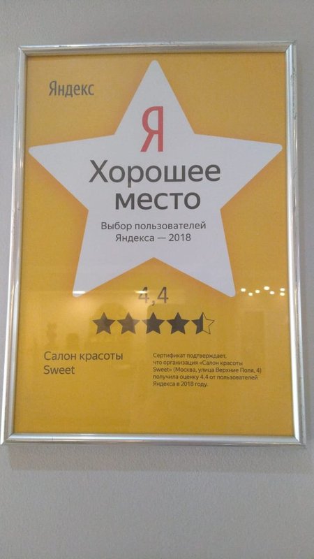 Очень хороший салон ! Уже более 10 лет являюсь постоянным клиентом, доверяю салону, поэтому езжу из других районов именно сюда. Конечно, я пробовала и другие салоны в разных ценовых категориях, но всегда возвращаюсь в Sweet. Здесь можно не переживать о безопасности, салон очень ответственно относится к качеству всех материалов, к подбору мастеров, уборкам и дезинфекциям. Ирина мой любимый косметолог, очень жду каждой нашей встречи :)